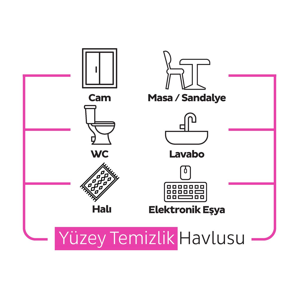 *Cam, Ahşap ve seramik yüzeylerde. Masa tezgah ve ocak yüzeylerinde. Telefon, tablet ve TV yüzeylerinde. Wc, Lavabo, Banyo temizliğinde. Halı, Koltuk ve Mobilya Temizliğinde Durulama gerektirmeyen, pratik, hijyenik, kullan-At, yüzey temizlik havlusu